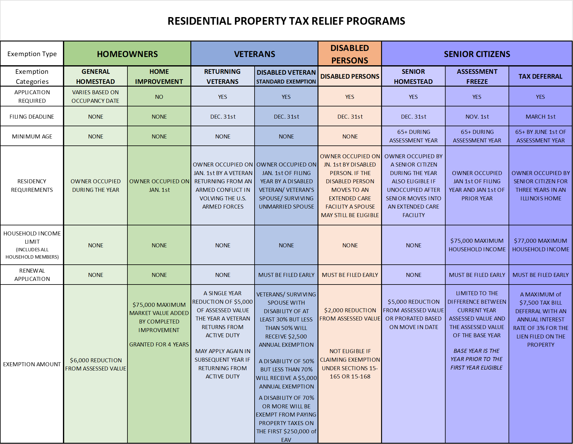 The Illinois Homestead Exemption Program offers several different programs designed to provide property tax relief to homeowners. Through a variety of exemptions, this program lowers the equalized assessed valuation of your property to which the tax rate is applied to determine your property tax bill. The following guide has been prepared to provide general information regarding these programs and to answer the most frequently asked questions. Eligibility requirements vary widely among these exemptions and it is important to review the criteria for each exemption carefully; however, in all cases, you must live at the property to qualify for any of these exemptions. All exemptions, except for the Homestead Improvement Exemption, are handled by the Boone County Supervisor of Assessments. You can find the forms you need on their website https://www.boonecountyil.org/government/departments/assessment_office/forms___brochures.php or the Homestead Improvement Exemption form is available on this website under forms and documents.